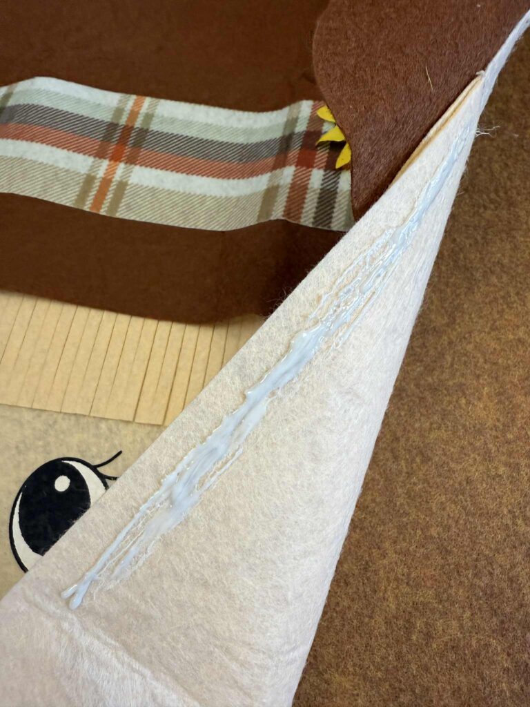 After cutting the hat, glue the scarecrow head onto the brown felt. Apply Surebonder fabric glue along the inside edge of the scarecrow head, but make sure to leave the bottom of the head open.