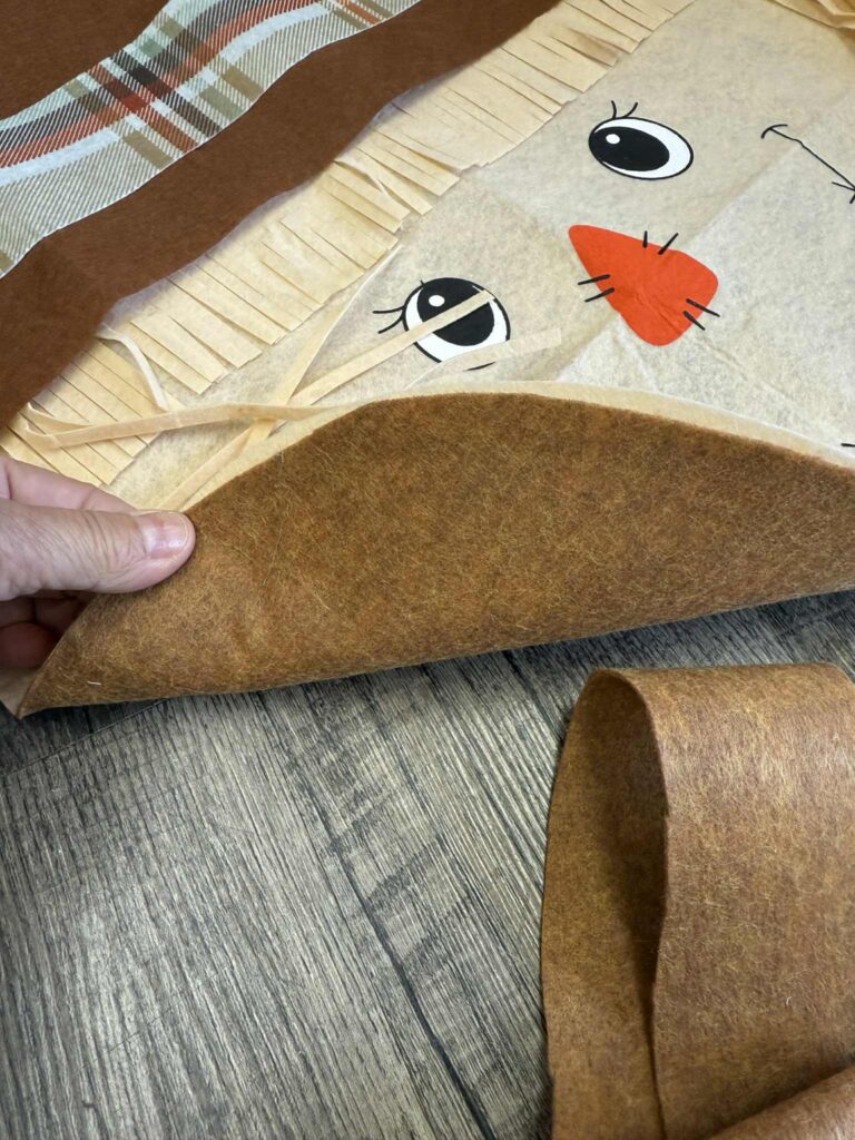 Next, carefully trim away any extra brown felt surrounding the scarecrow head. Take your time to follow the shape closely so the edges look neat and clean, giving your door hanger a polished finish.