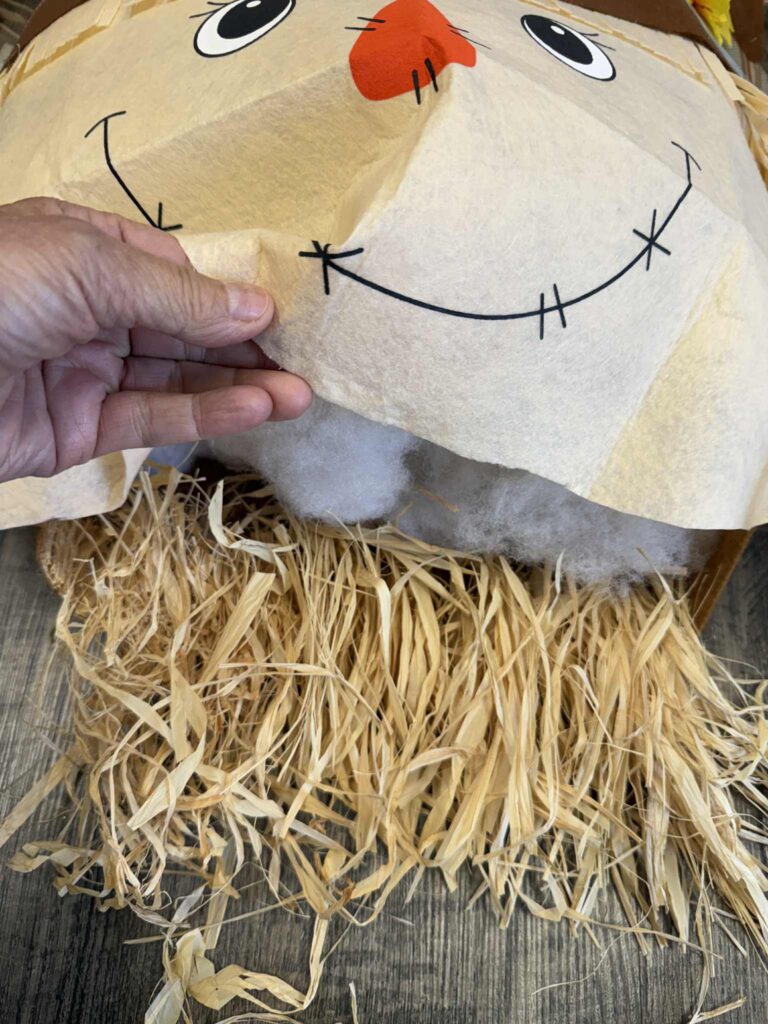 Fill the scarecrow head with poly-fil to give it some shape and dimension. Next, tuck in the raffia for that classic straw look. Use a bit of Surebonder fabric glue to secure the raffia so it stays neatly in place.
