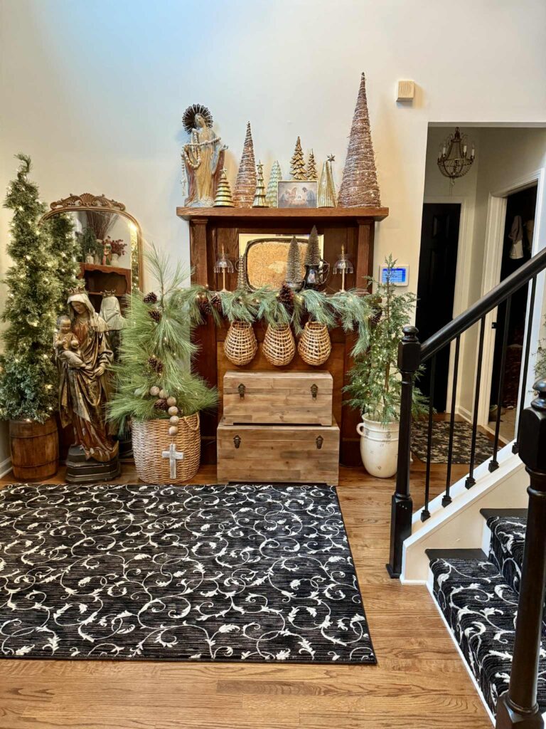 You’ll notice that I brought a variety of trees into the foyer, and they instantly made the space feel warm and inviting. I just can’t help myself—I love having trees and soft twinkling lights up all year long. They add such a magical glow, no matter the season, and they make the entryway feel so cheerful the moment you walk through the door.