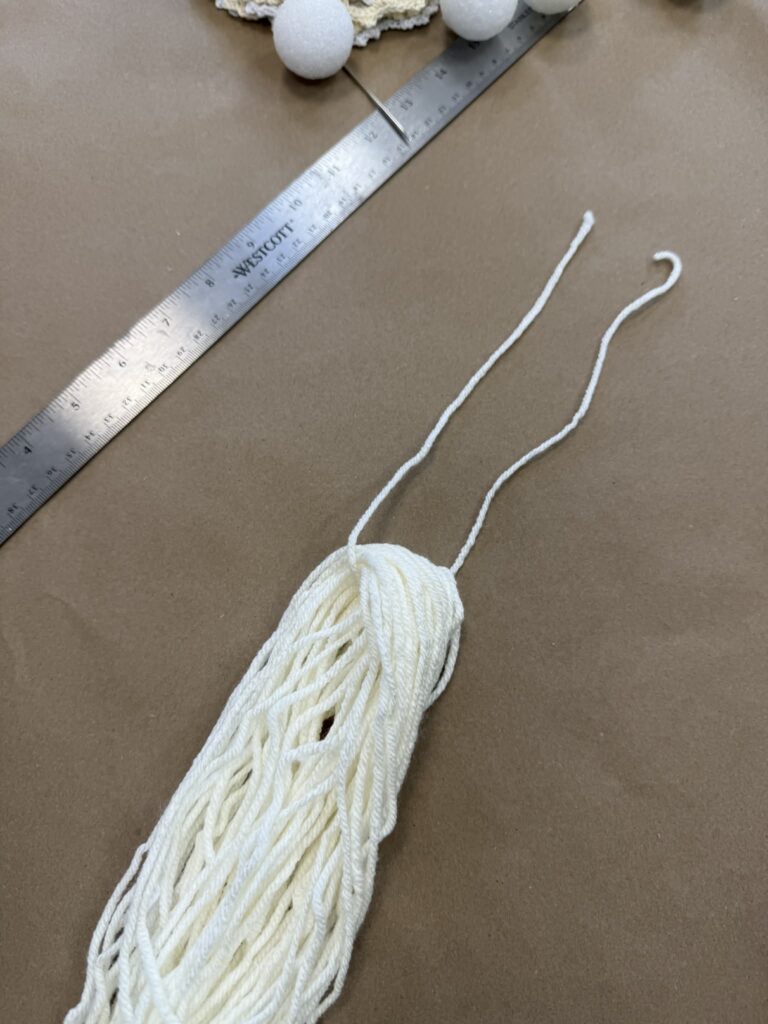 The first step is to wrap the yarn back and forth to create the base for your angel. You can make the yarn bundle as long and as full as you’d like, depending on the size and fullness you want for your finished piece. For this DIY angel craft, I’ll be wrapping mine to about 18 inches long to create a soft, full look that works perfectly for handmade holiday decor.