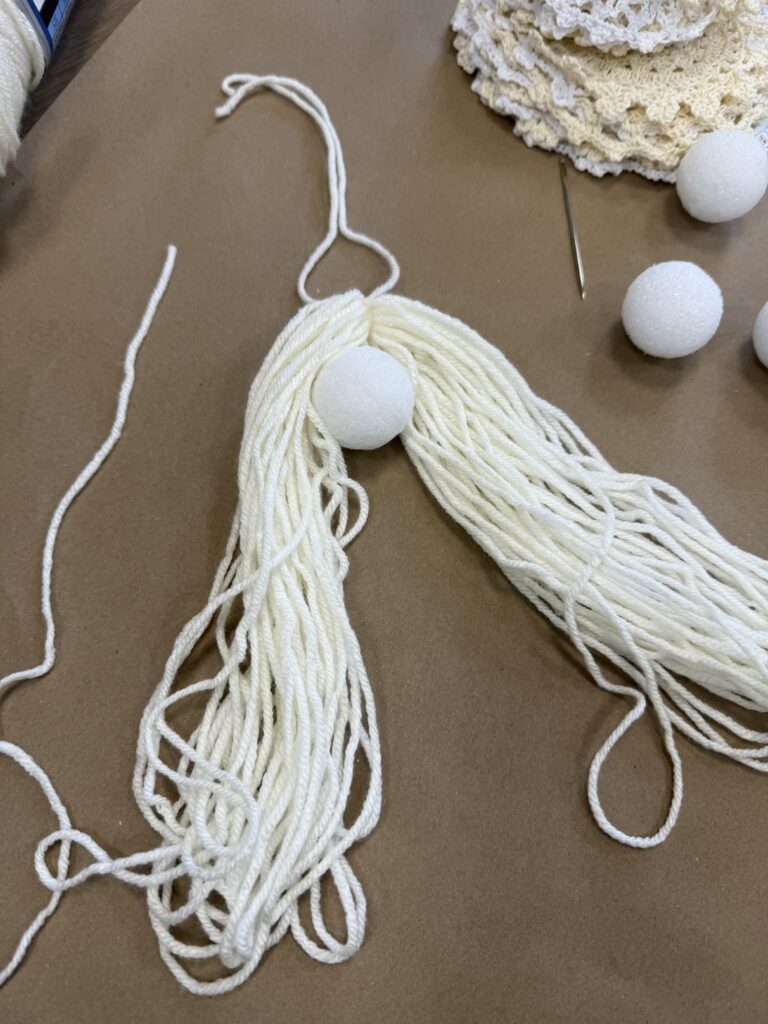 Place the Styrofoam ball in the center of the folded yarn bundle, as shown in the photo above. Gently pull the yarn up and around the ball to fully cover it, creating the head of your DIY angel. Once the ball is completely covered, use a separate piece of yarn to tie it securely in place. This step helps define the angel’s head and gives your handmade angel decoration a clean, finished look.