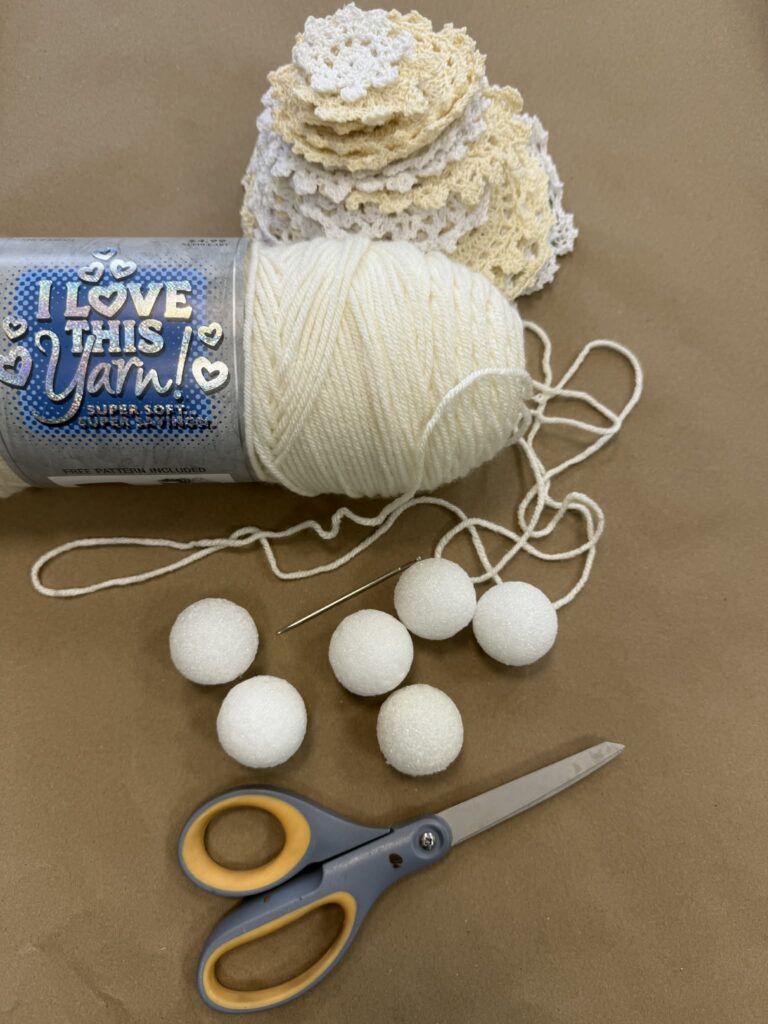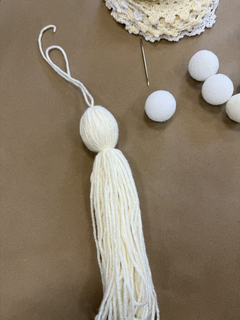 Once you’ve cut the hole in the center of the doily, slide the top of the yarn bundle through the opening. Gently pull the doily up and position it around the neck area of the angel. This step helps form the angel’s dress and adds that beautiful vintage texture that makes this DIY angel decor so charming and unique.