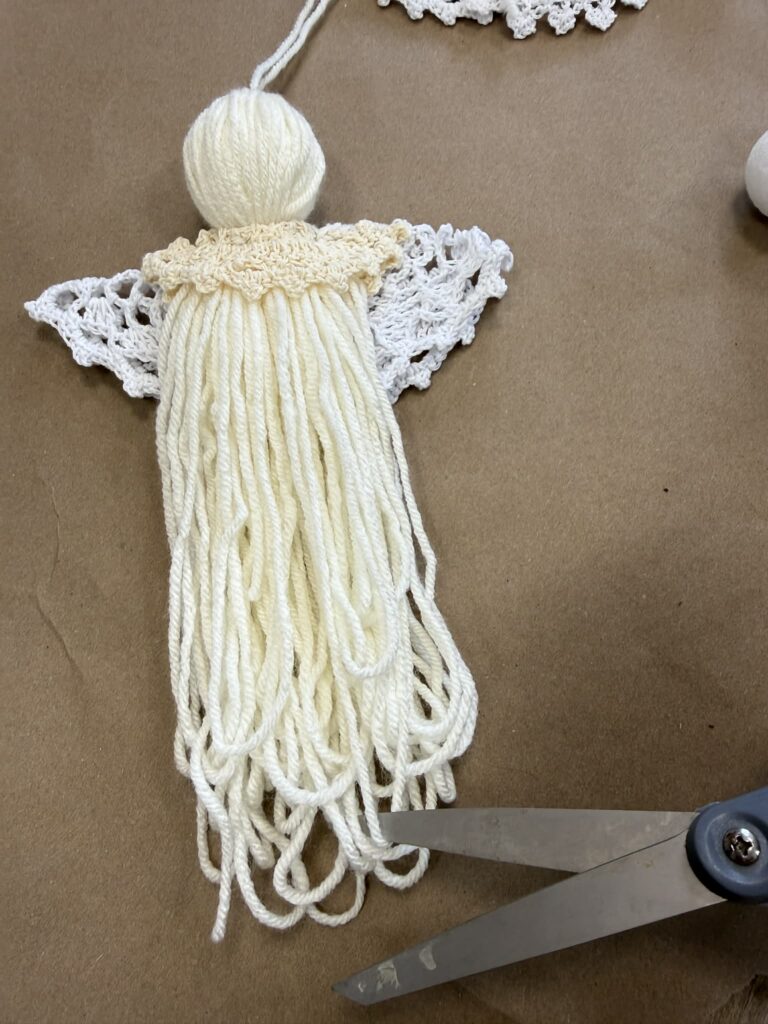 The final step is to cut through the loops at the bottom of the angel to create a soft, flowing fringe. This gives your DIY yarn angel a fuller, more finished look and adds beautiful texture to your handmade angel decor.