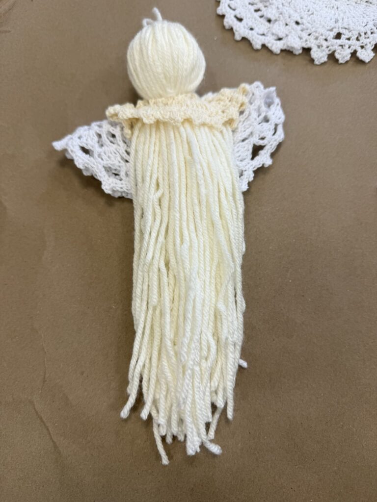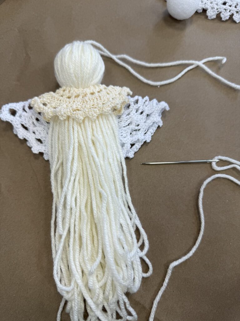 Next, fold a second doily in half to create the angel’s wings and position it on the back side of the angel. Once you’re happy with the placement, use a doll needle and a piece of yarn to stitch and secure the doilies in place. This step gives your DIY angel beautiful layered detail and adds even more vintage charm to your handmade angel decoration.