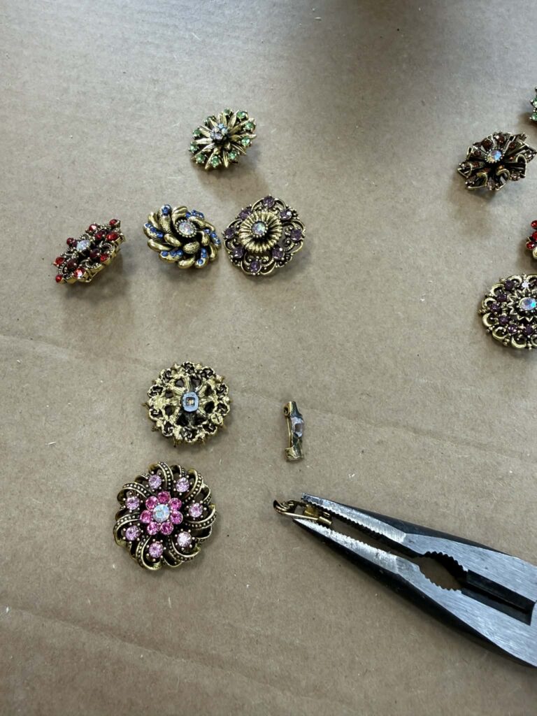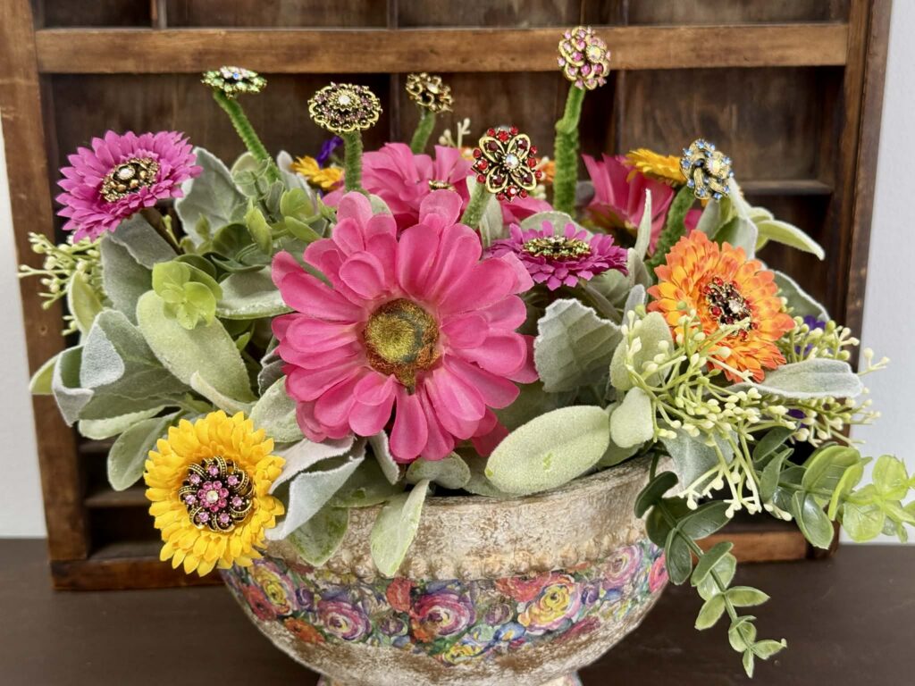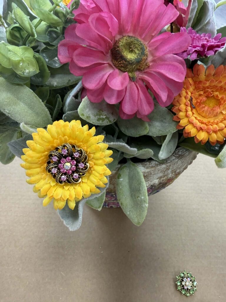 Next, add six decorative brooches to select flowers to give the arrangement a unique and eye-catching detail.