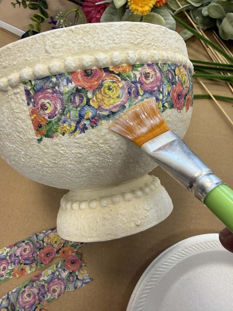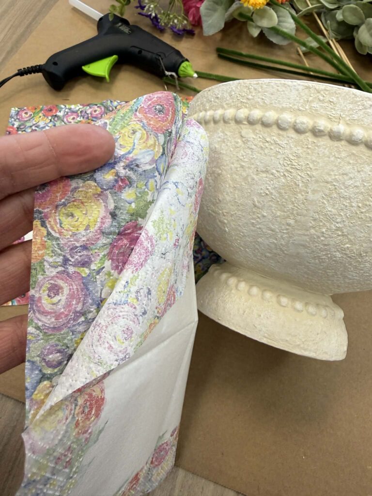 This napkin adds the perfect pop of color to the planter. I applied a layer of Mod Podge to the surface and then carefully placed the napkin on top.