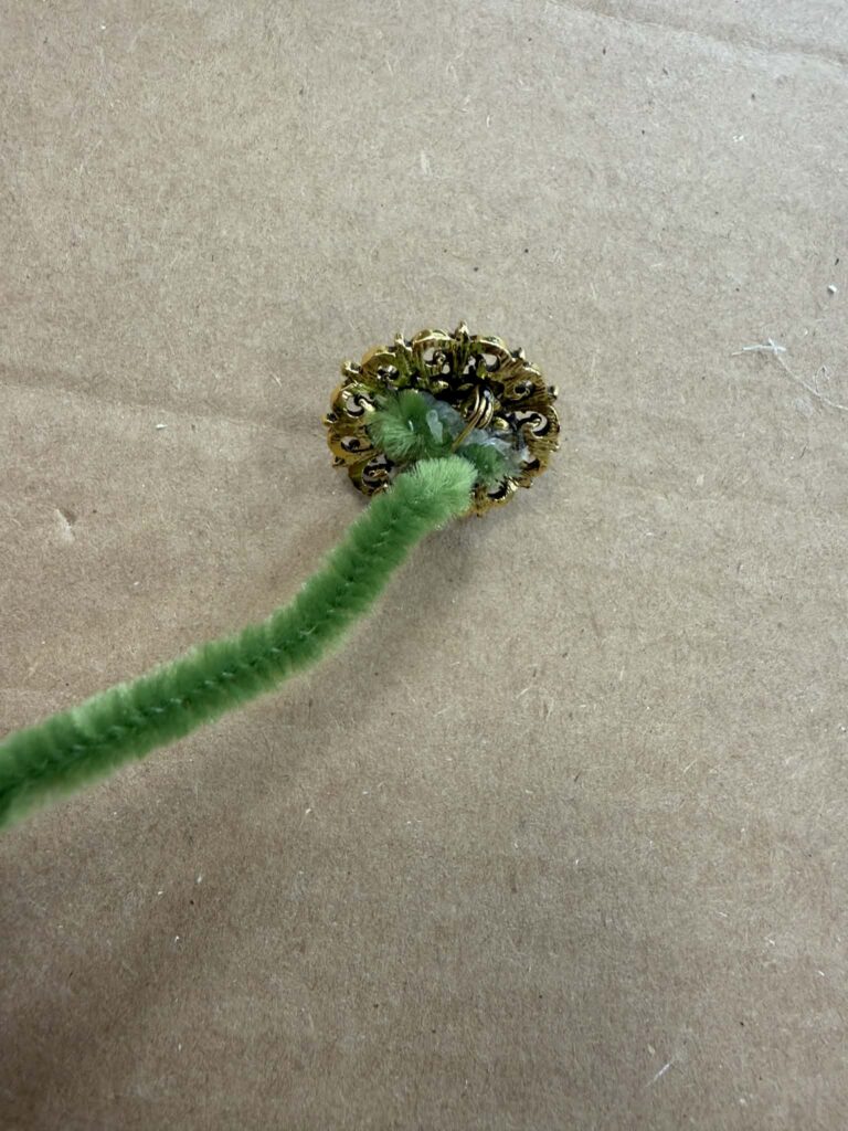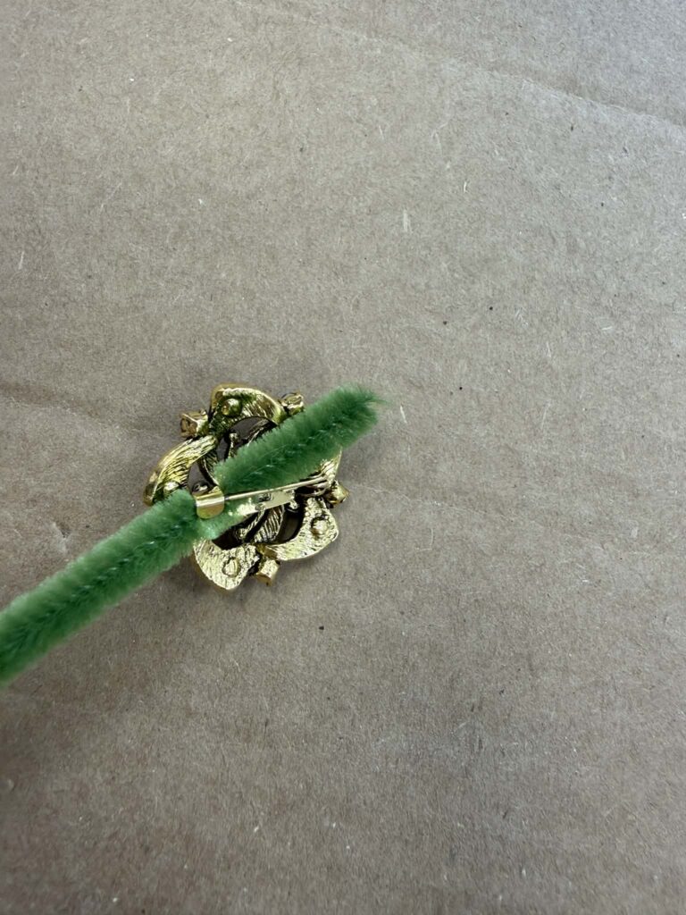 Start by threading the pipe cleaner through the pin on the brooch and securing it with a bit of hot glue. Fold the pipe cleaner over the pin, then attach the wooden skewer. Begin wrapping the pipe cleaner around the skewer about 2 inches from the top.