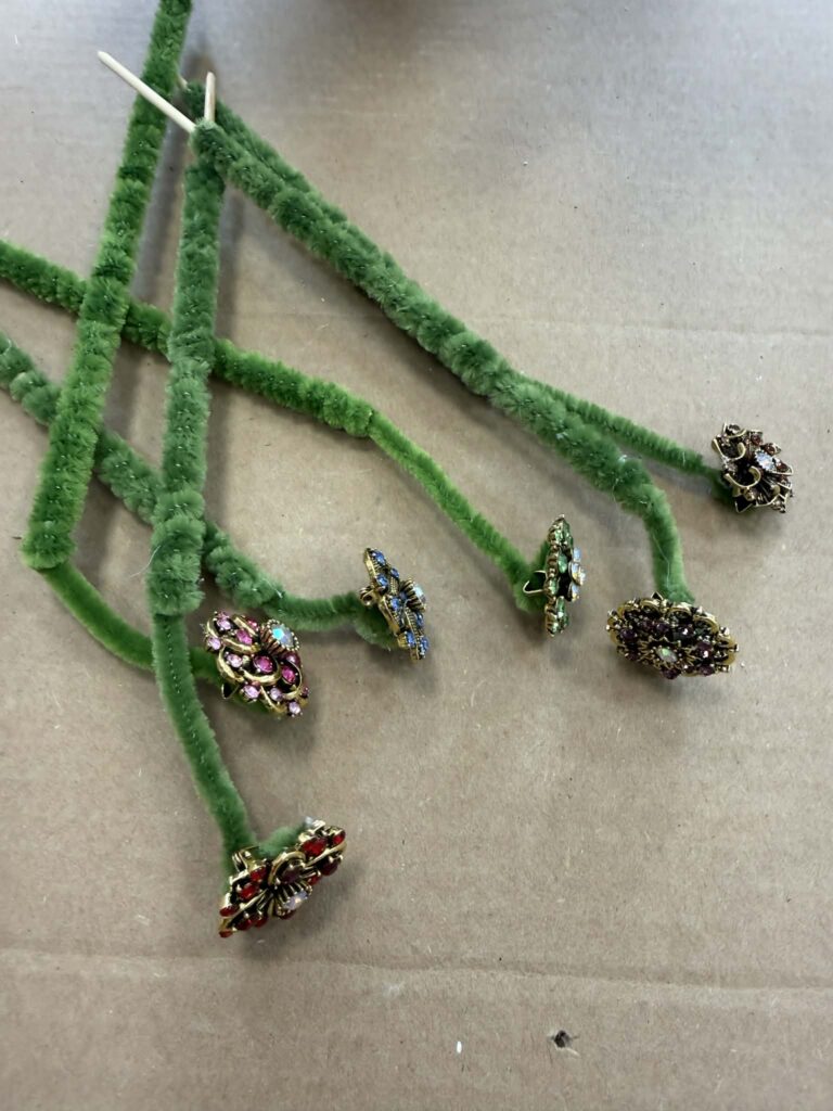 The remaining six brooches can be attached to green pipe cleaners and wooden skewers.