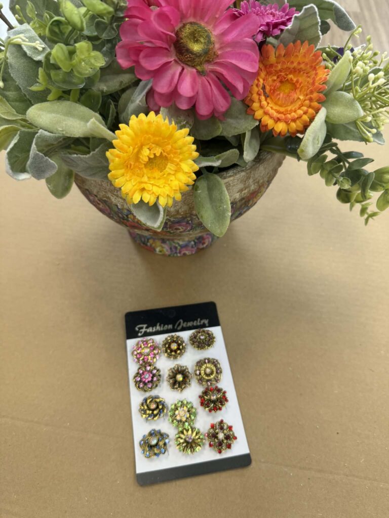 Next, randomly attach the six decorative brooch pieces to different flowers using glue to add a unique, eye-catching detail.