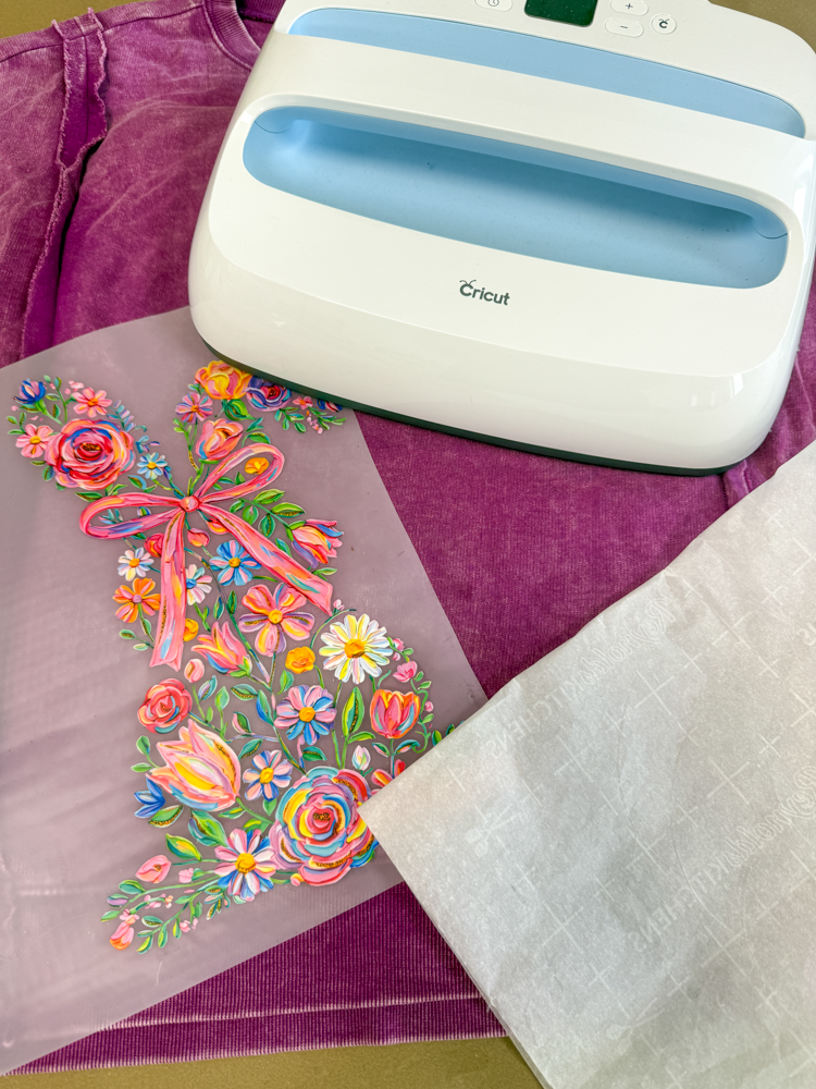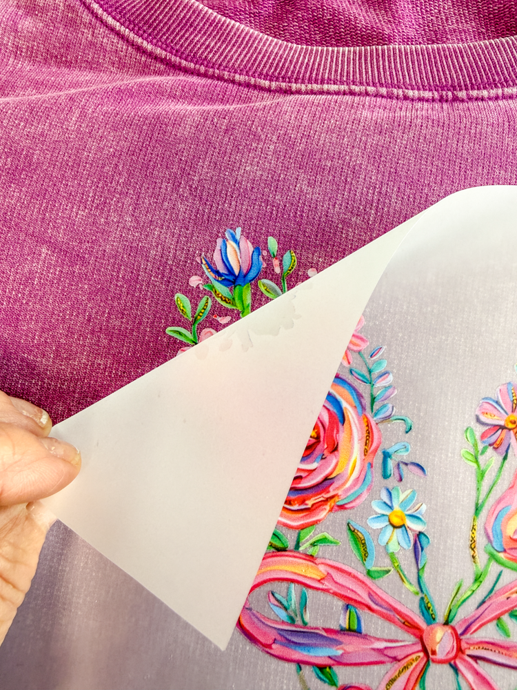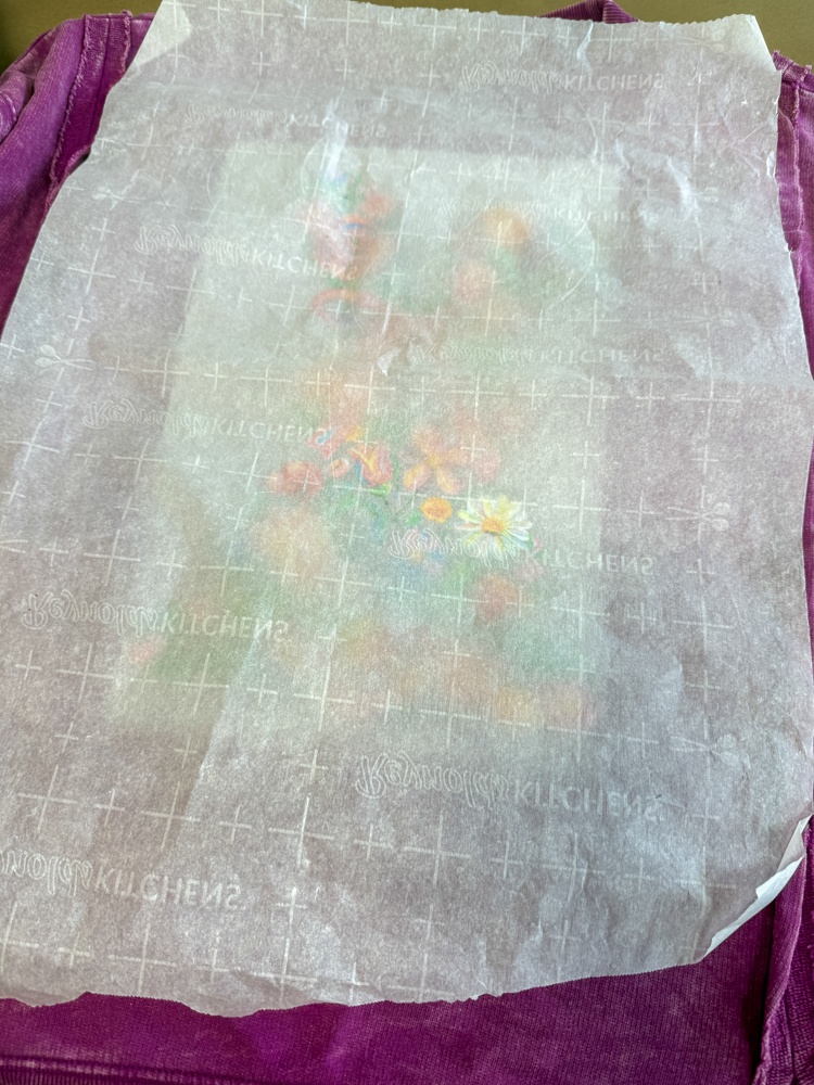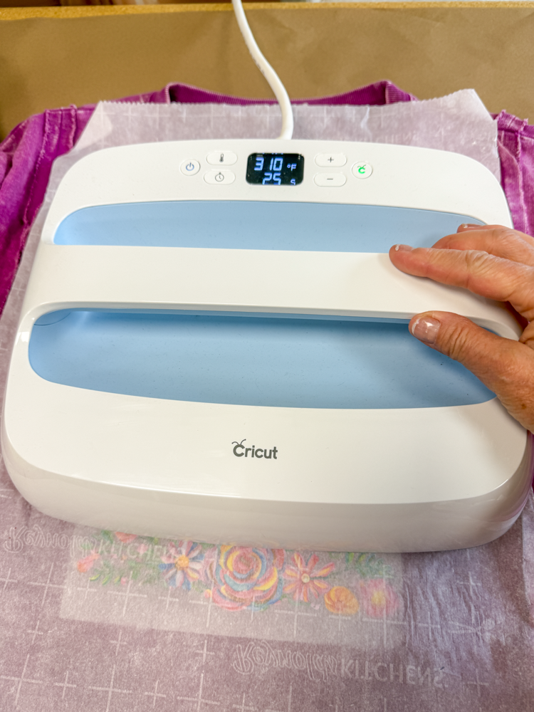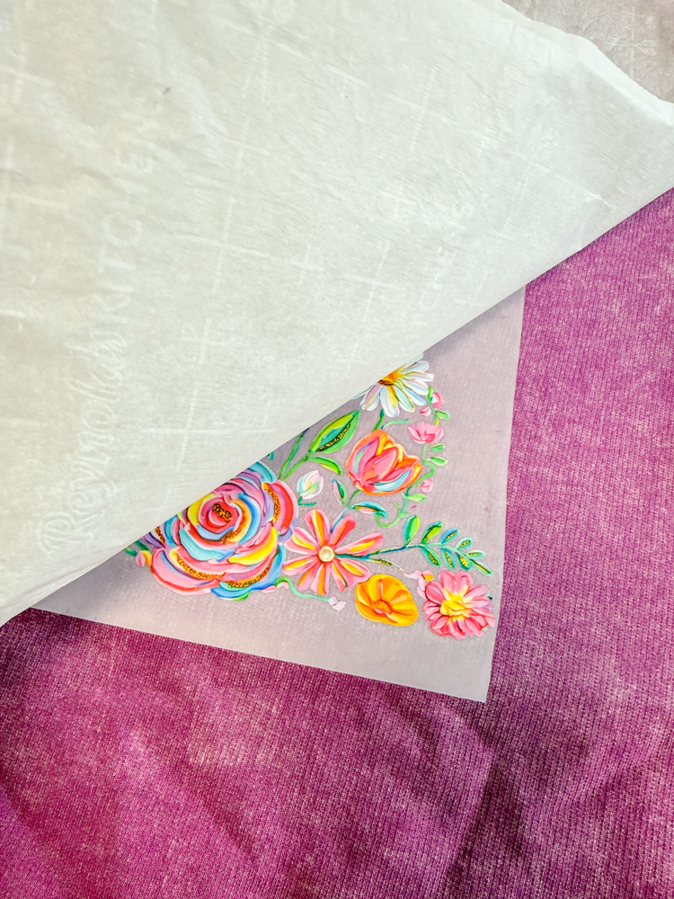 Once you peel off the original transfer paper, place the parchment paper back over the design and give it another quick 5-second press. This helps lock the transfer in place.