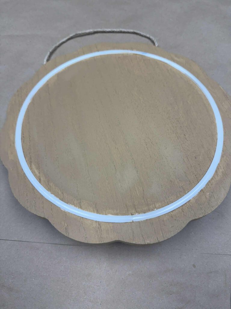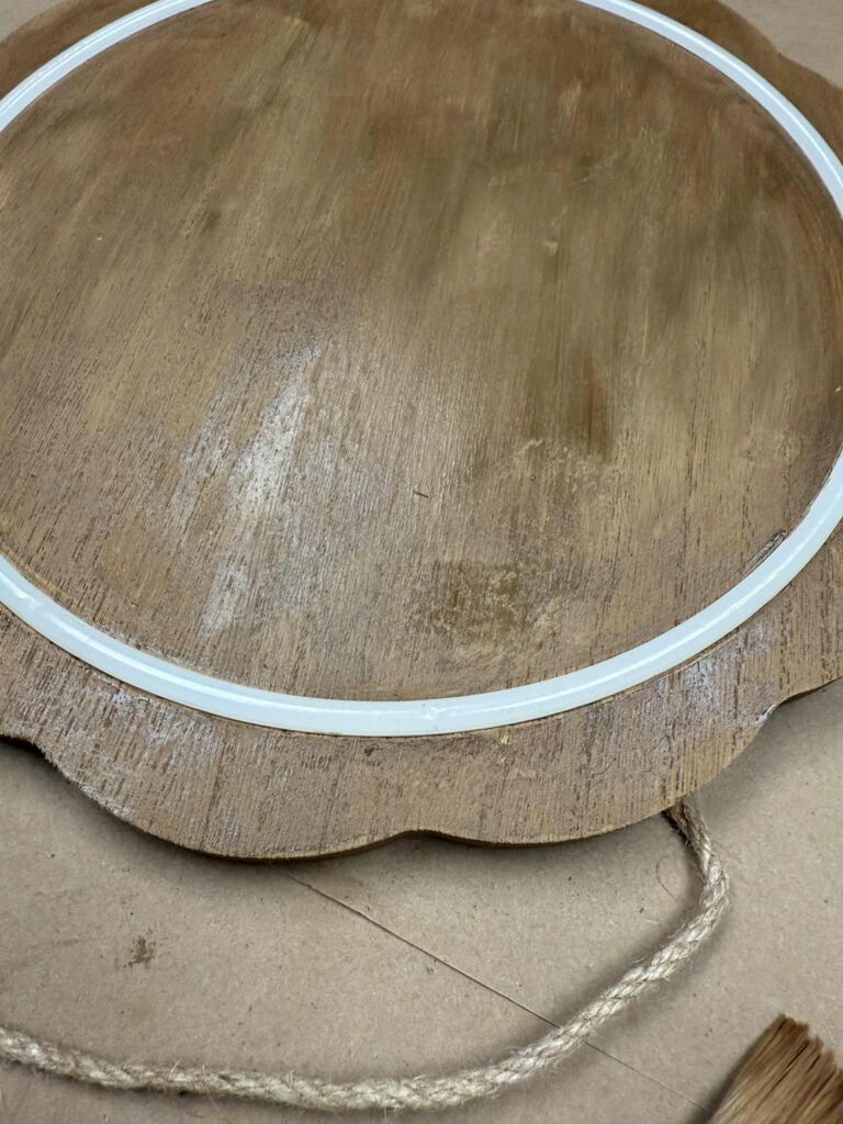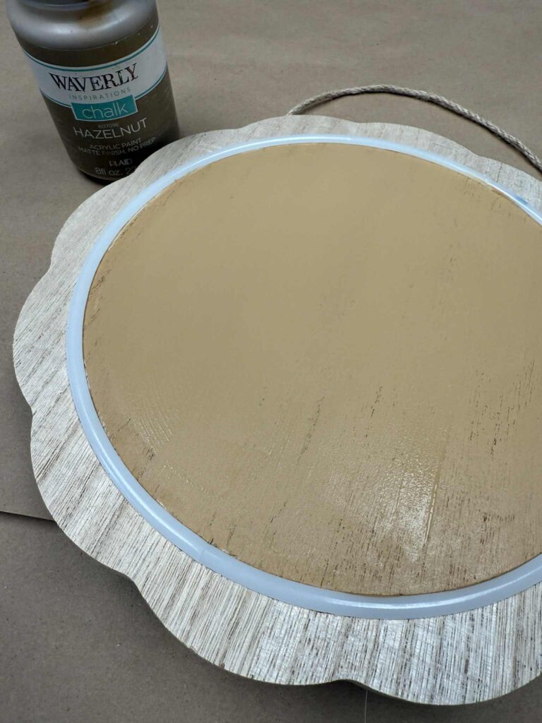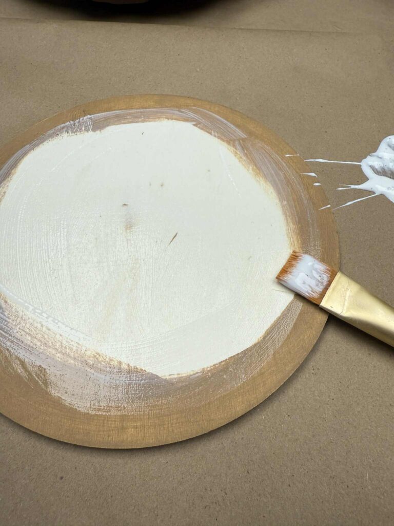 I brushed a little of the chalk paint around the edge of the craft circle. Since the rice paper will go in the center, I left that area unpainted. Then I added a layer of Mod Podge and placed the rice paper on top.
