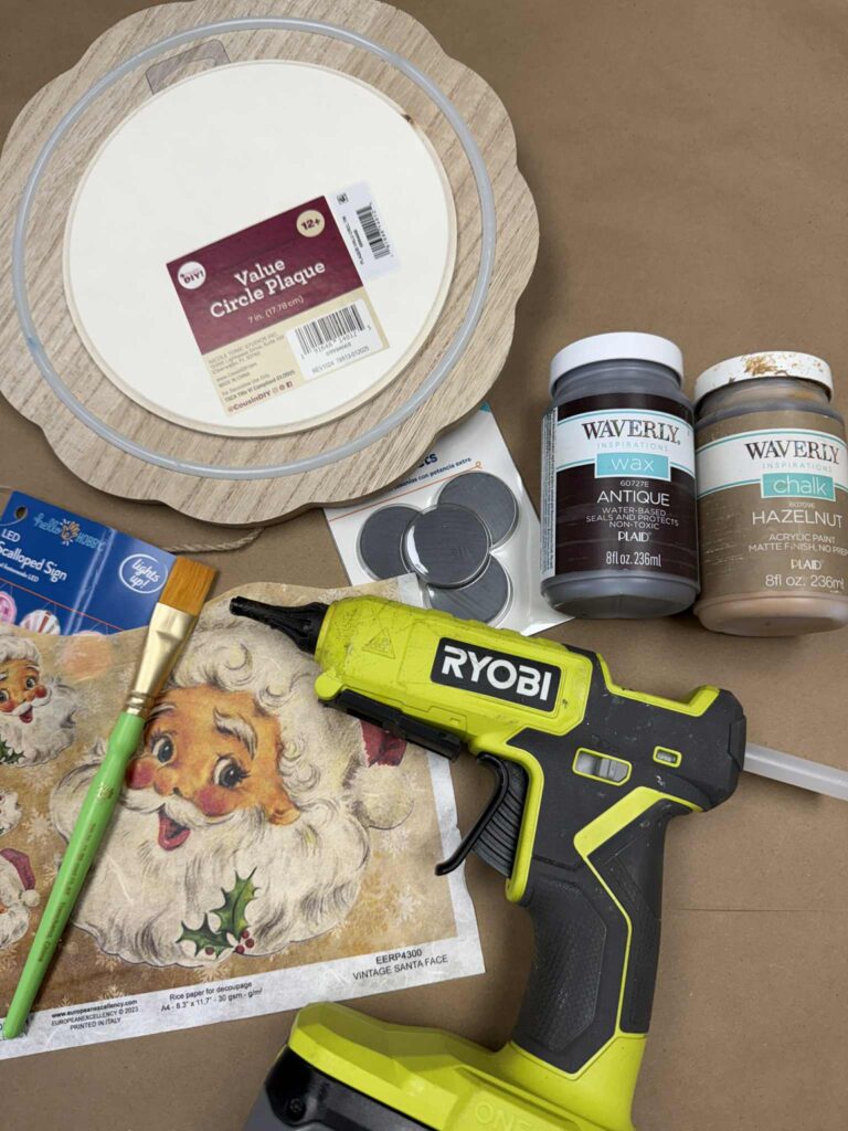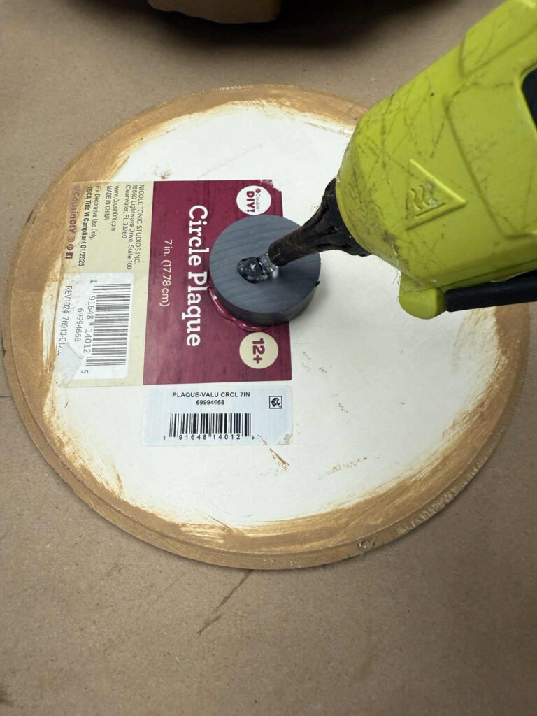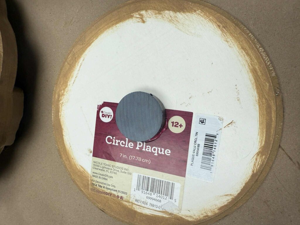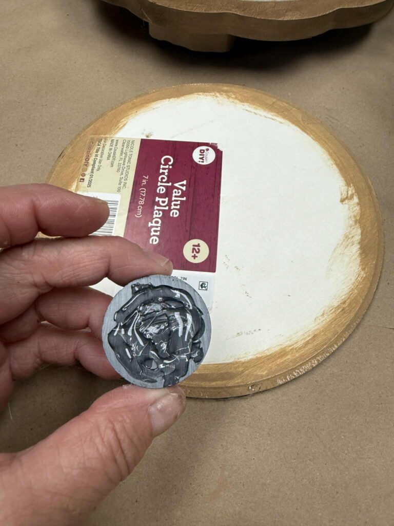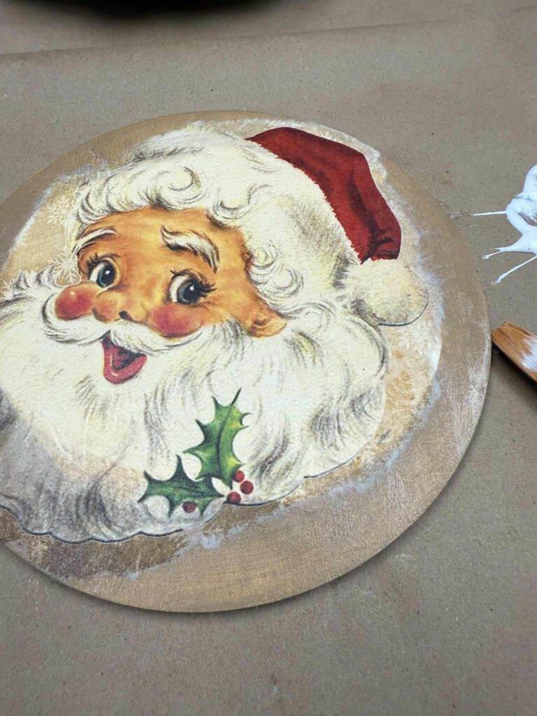 I brushed a little of the chalk paint around the edge of the craft circle. Since the rice paper will go in the center, I left that area unpainted. Then I added a layer of Mod Podge and placed the rice paper on top.