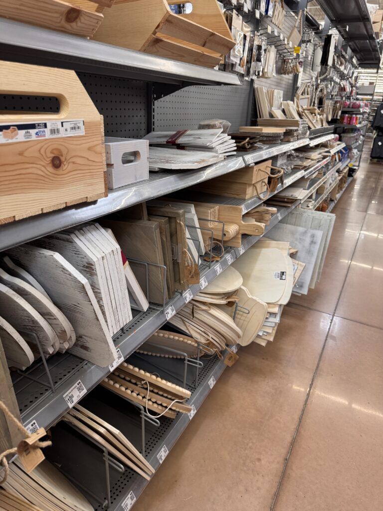 Oh, I could spend all day in this aisle! There are trays, signs, boxes—you name it! These are my favorite for painting, stenciling, and adding napkins or bling. I like to grab a few and let the ideas come to me later.
