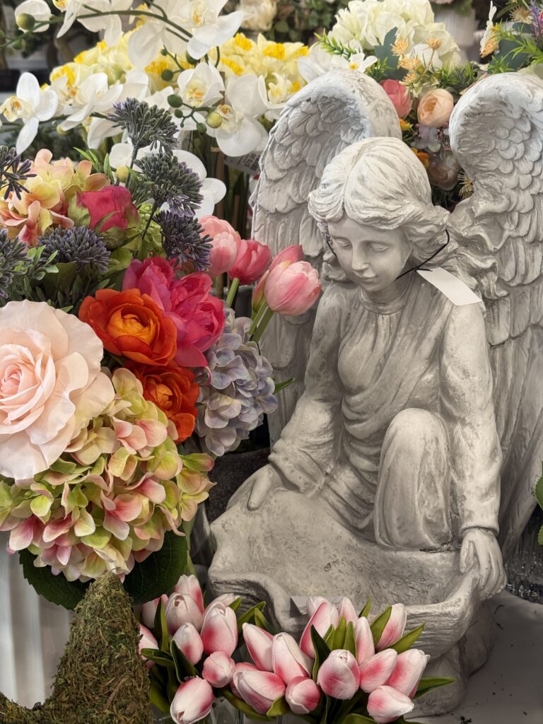 The angel statue paired with soft florals creates such a peaceful spring display.