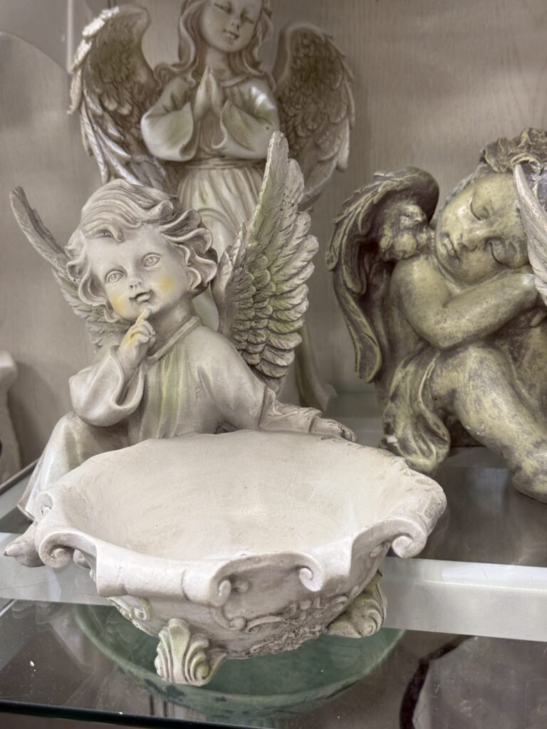 I love the flower bunny wreaths and the angel statue. The angel with the bowl would be a great piece too!
