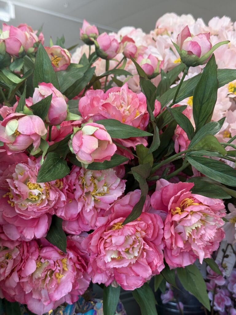 The pink peonies are full, fluffy, and absolutely stunning up close.