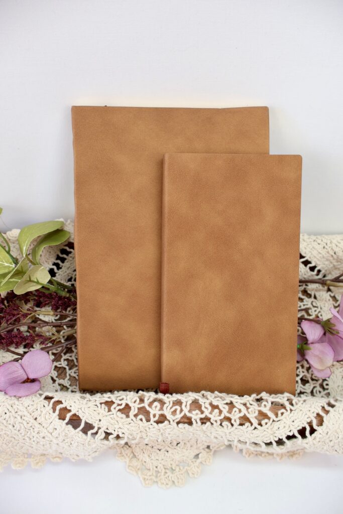 Both journals feature a smooth brown cover and include 96 blank pages, perfect for your creative touches. Each one also comes with a ribbon bookmark to help you keep your place.