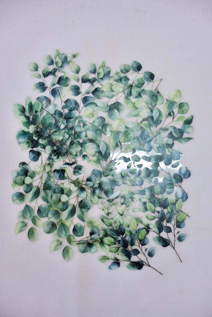 The kit also includes a 20-piece eucalyptus sticker set. These delicate stems feature soft, rounded leaves in shades of green and teal, perfect for adding a natural and calming touch to your pages. They layer beautifully with florals or stand on their own to give your journal spreads a fresh, botanical feel.