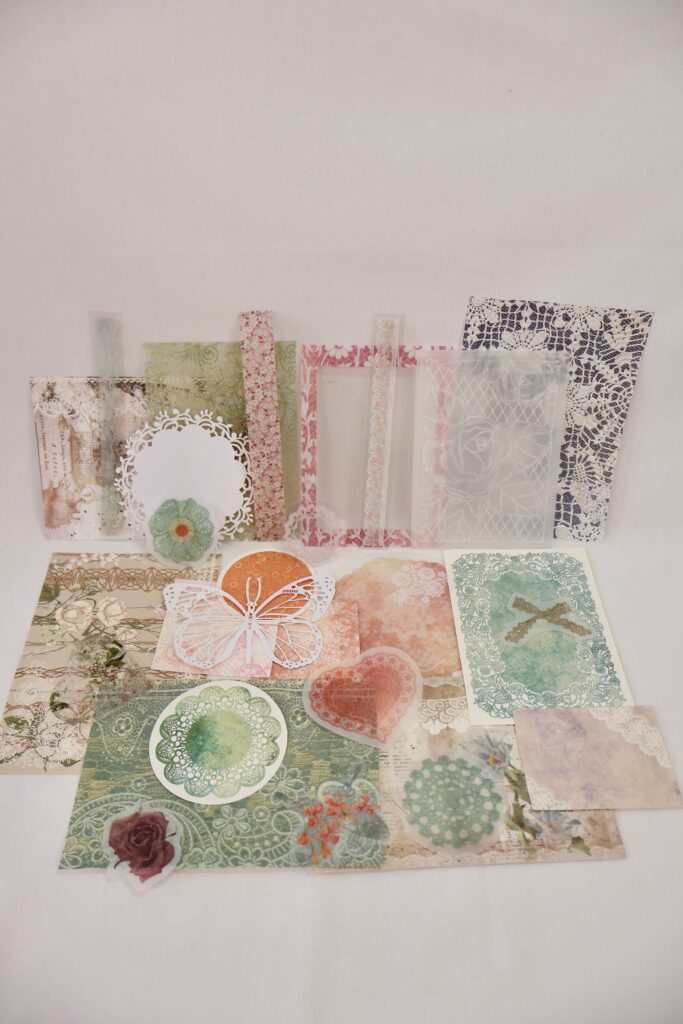 This bundle is packed with a variety of paper and plastic pieces that are perfect for layering and adding dimension to your pages. You’ll find a mix of textures—some pieces are sheer, some are completely see-through, while others are sturdy paper cutouts or flexible plastic accents. From delicate lace-inspired prints to whimsical shapes like butterflies and hearts, this assortment gives you endless ways to play and create unique designs in your junk journal.