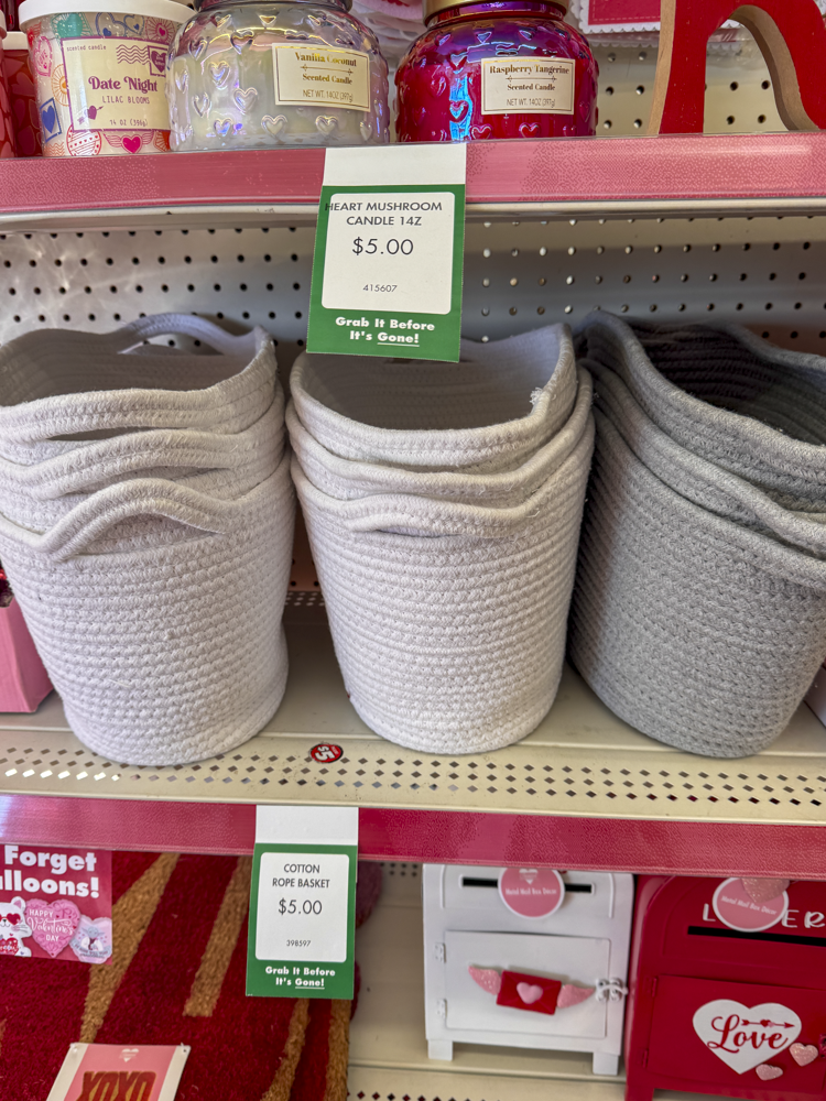 Neutral rope baskets that are perfect for softening up pink and red decor.