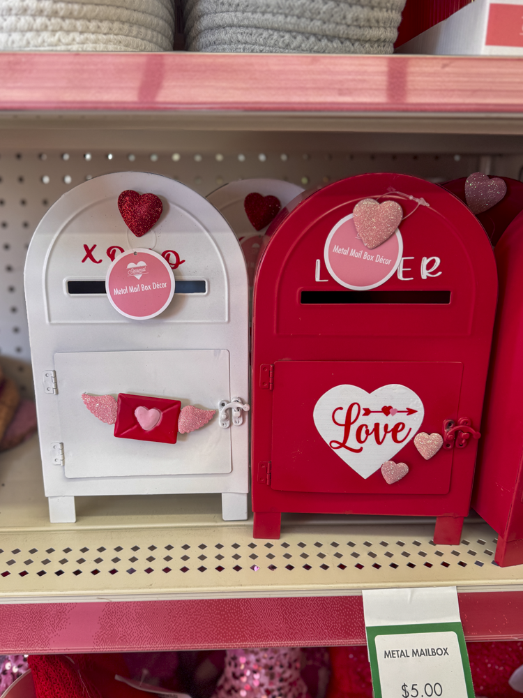 A soft pink mailbox that feels playful and perfect for Valentine’s decorating.