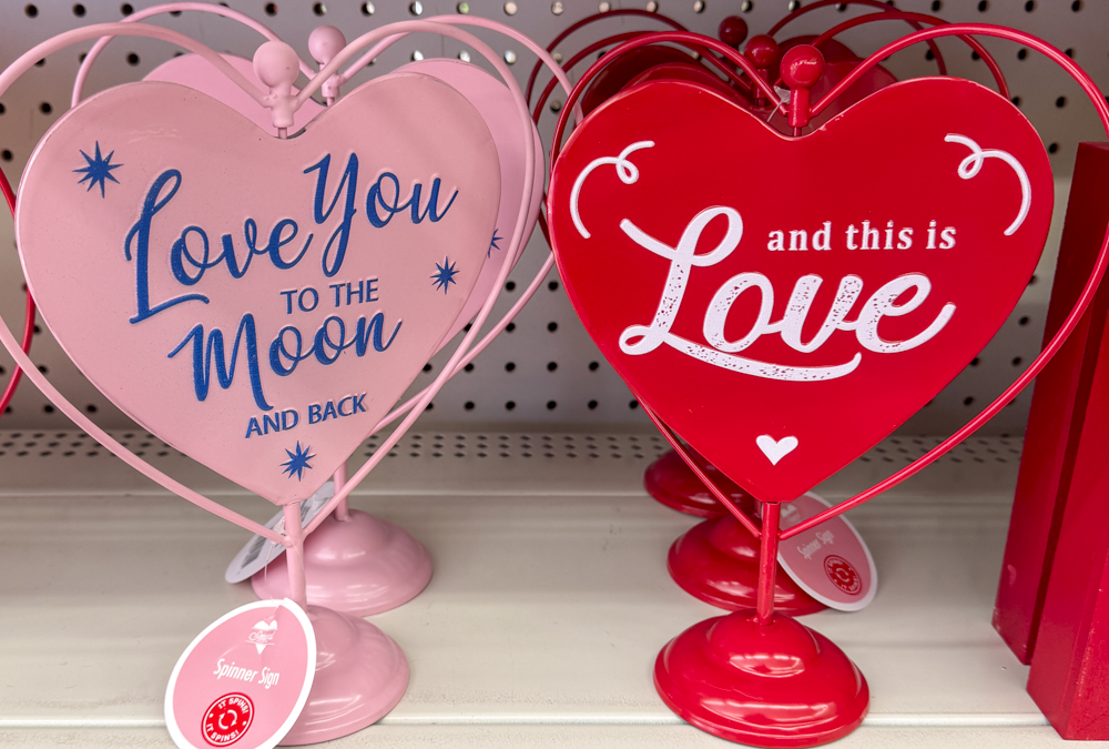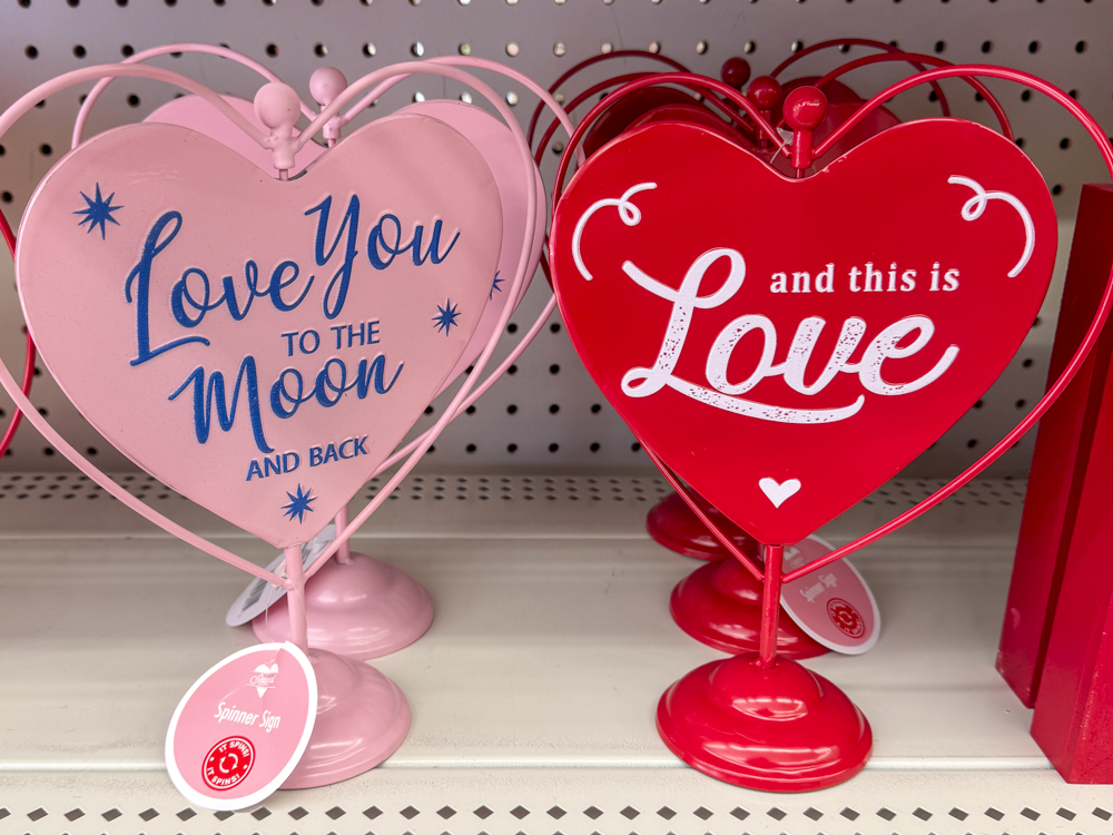 Sweet tabletop heart signs that add charm to shelves, trays, or tiered displays.